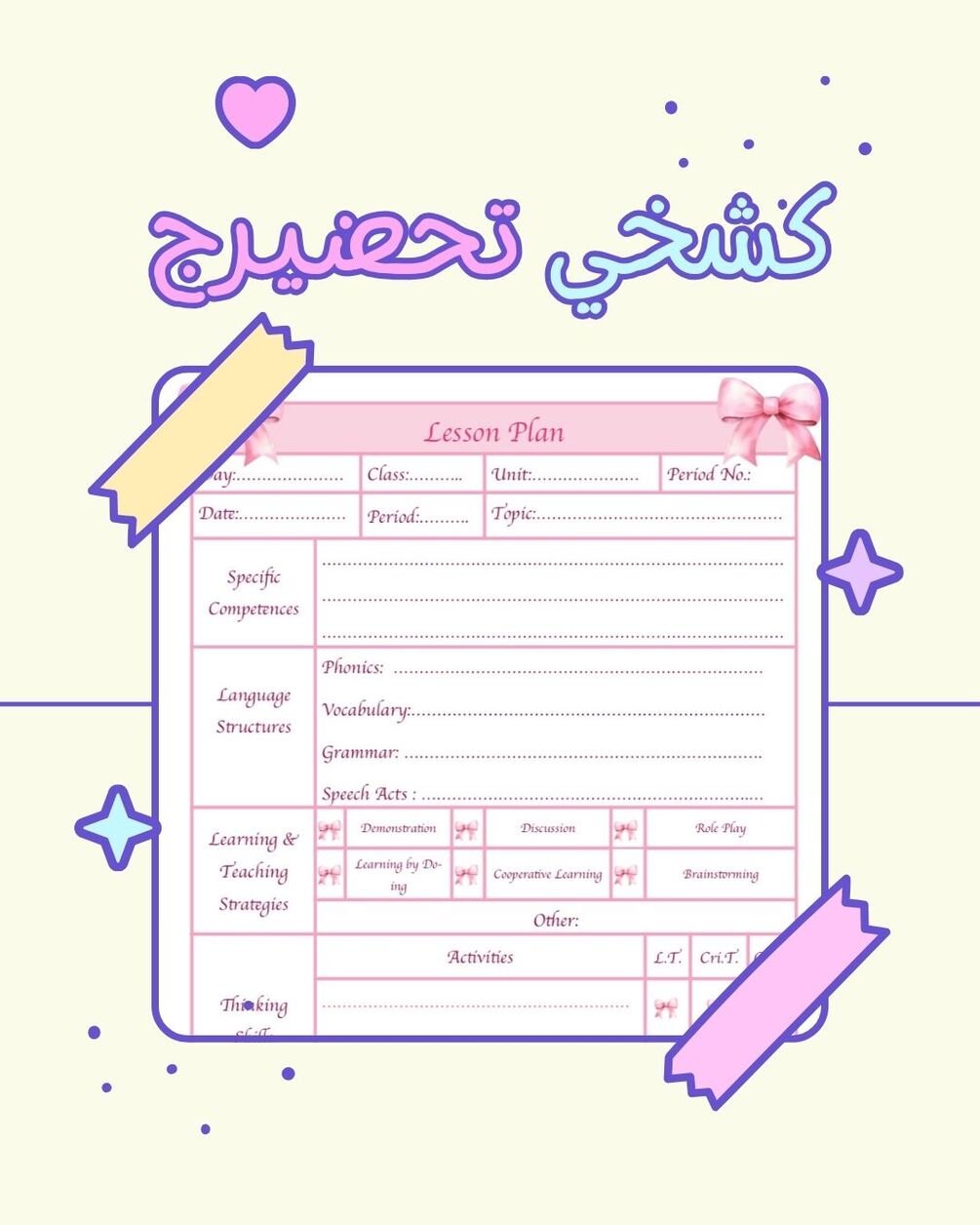 أضفي لمسة من الأناقة على تحضيراتك اليومية مع هذا القالب اللطيف المصمم بشكل فيونكة ! مثالي للمعلمات اللواتي يفضلن التنظيم بأسلوب أنثوي وراقي. القالب قابل للتعديل بالكامل عبر بيجز-ورد ، مما يجعله سهل الاستخدام وعملي لجميع المراحل.